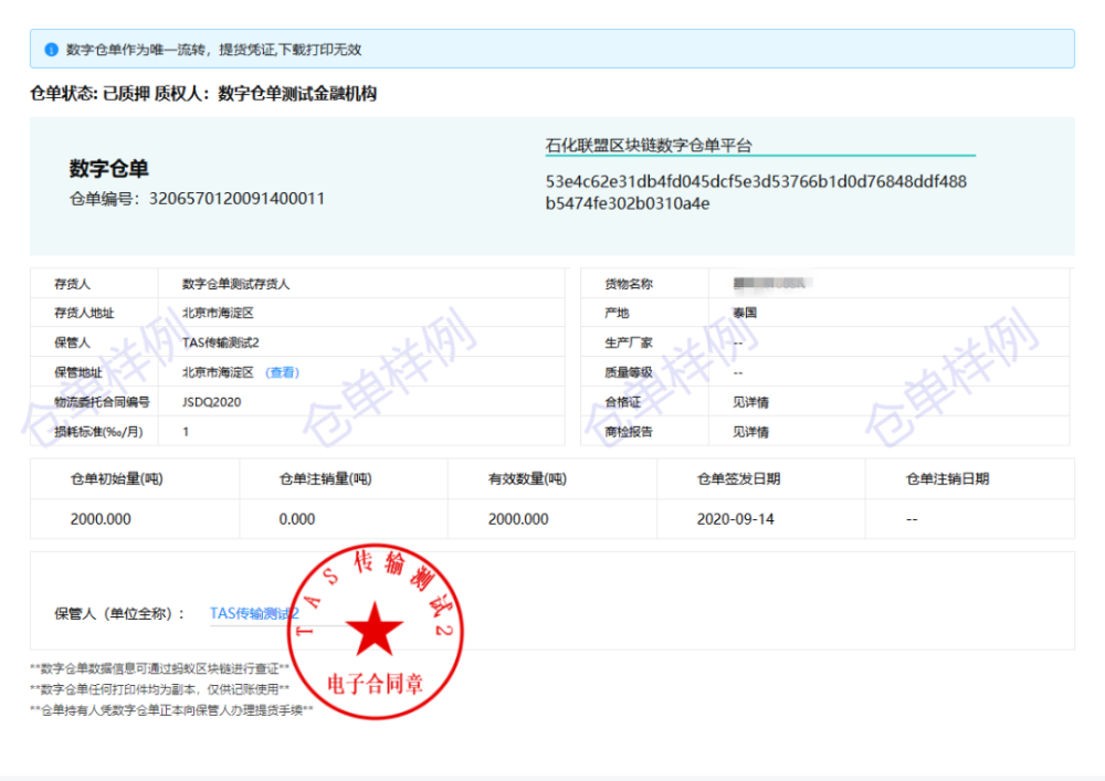“区块链数字仓单平台”实现数字仓单与仓储货物严格对应,并利用物联网技术对数字仓单下货物进行严密监控,有仓单即有货;解决货物交付难题,实现秒交付、秒质押, 解决了四流合一难题;通过区块链技术进行存证,数据不可篡改,保证数据唯一性,可溯源;所有操作通过电子签章确认,实现法人与仓单对应,避免虚假仓单;对于仓单出质,实时在人民银行征信中心“中登网”登记,实现权属变化与仓单对应。