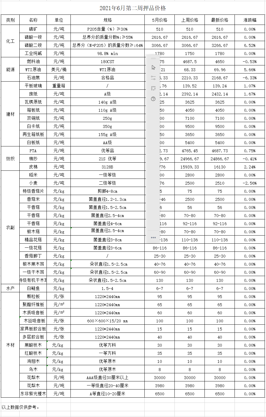 分类: 价格监测2021年6月11日分享此文章文章导航历史的文章历史的文章:谊嘉金融仓储再荣获“2020年全国金融仓储十强企业”殊荣未来的文章未来的文章:2021年6月份第一周价格监测近期要闻2025年11月第三周押品价格监测2025年11月24日2025年11月第二周押品价格监测2025年11月14日2025年11月第一周押品价格监测2025年11月14日2025年10月第五周押品价格监测2025年10月31日2025年10月第四周押品价格监测2025年10月24日2025年10月第三周押品价格监测2025年10月24日