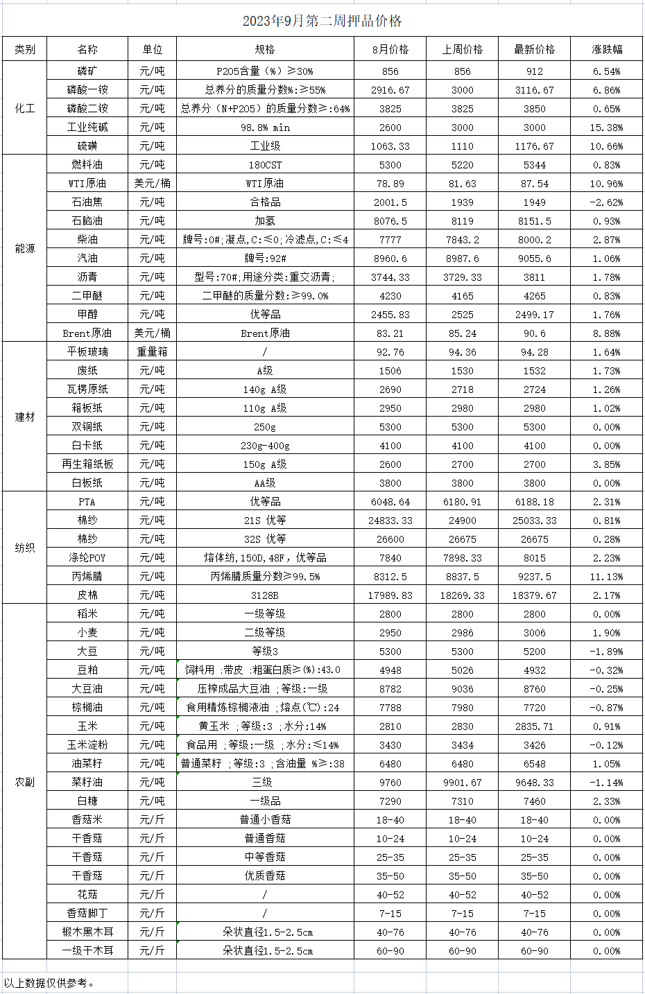 2023年9月份第二周价格监测