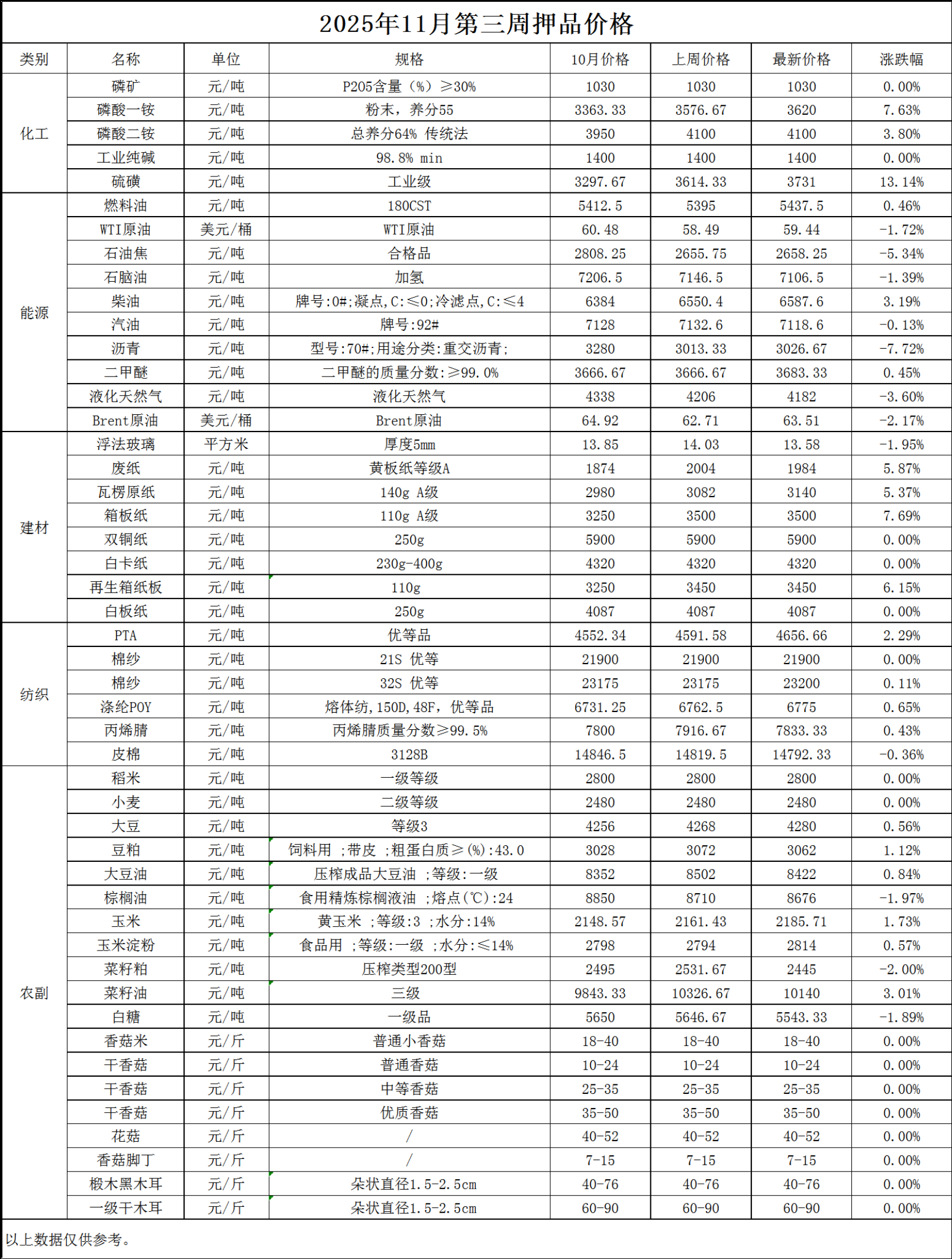 分类: 价格监测2025年11月24日分享此文章文章导航未来的文章未来的文章:2025年11月第二周押品价格监测近期要闻2025年11月第二周押品价格监测2025年11月14日2025年11月第一周押品价格监测2025年11月14日2025年10月第五周押品价格监测2025年10月31日2025年10月第四周押品价格监测2025年10月24日2025年10月第三周押品价格监测2025年10月24日2025年10月第二周押品价格监测2025年10月17日