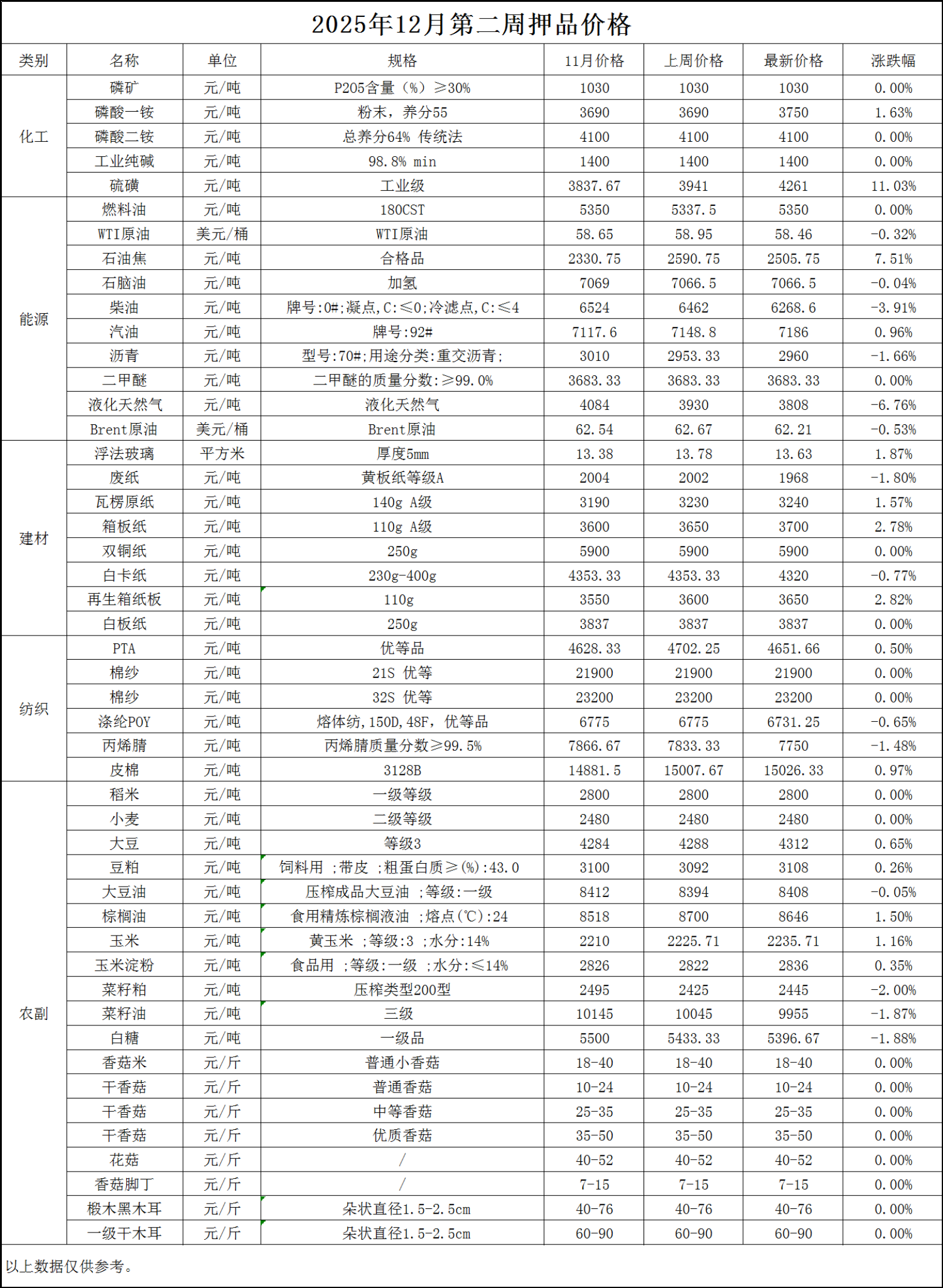 2025年12月第二周押品价格监测