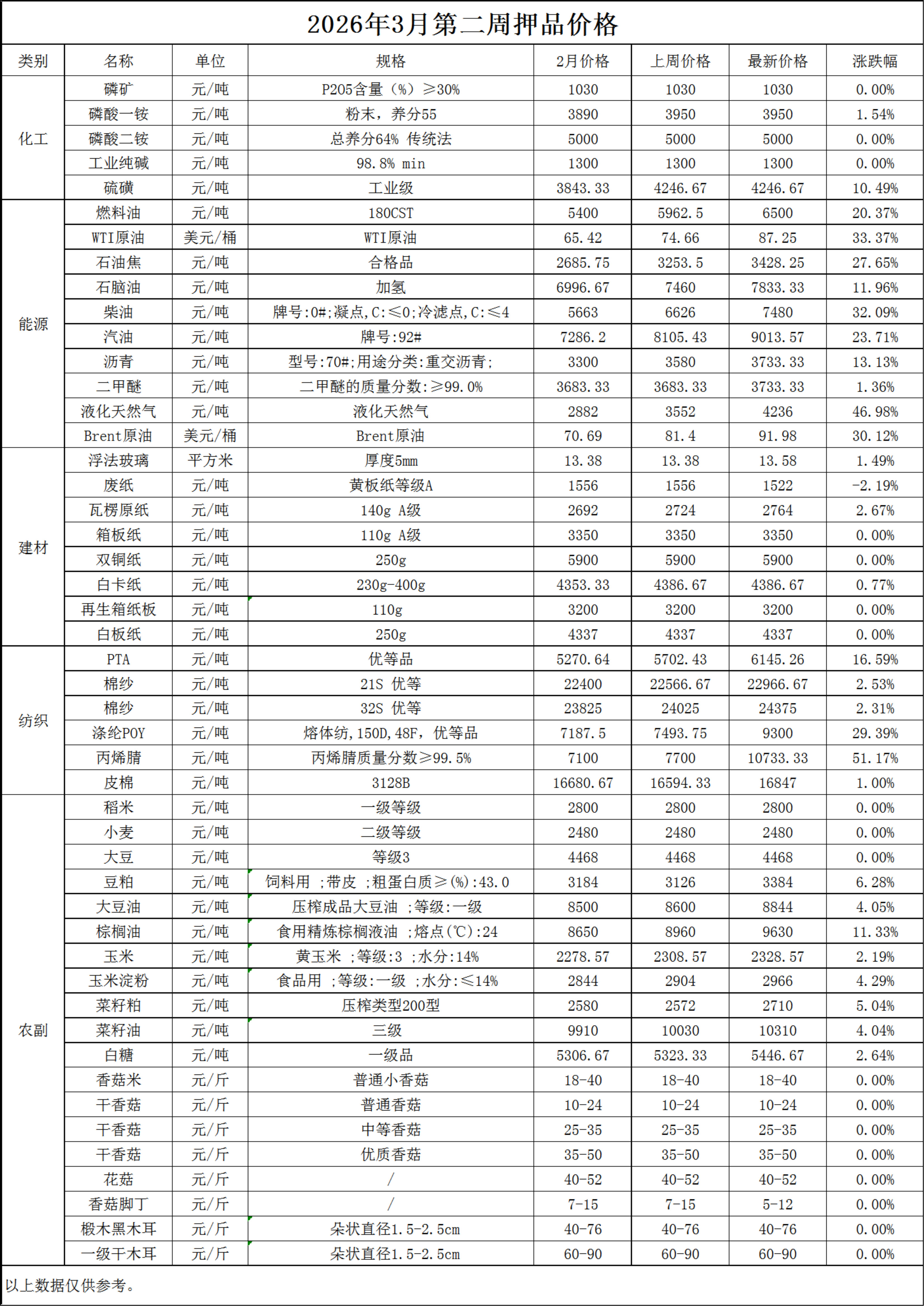 分类: 价格监测2026年3月16日分享此文章文章导航历史的文章历史的文章:2026年3月第三周押品价格监测未来的文章未来的文章:2025年12月第二周押品价格监测近期要闻2026年4月第一周押品价格监测2026年4月3日2026年3月第四周押品价格监测2026年3月27日2026年3月第三周押品价格监测2026年3月20日2025年12月第二周押品价格监测2025年12月12日2025年12月第一周押品价格监测2025年12月12日2025年11月第四周押品价格监测2025年12月12日