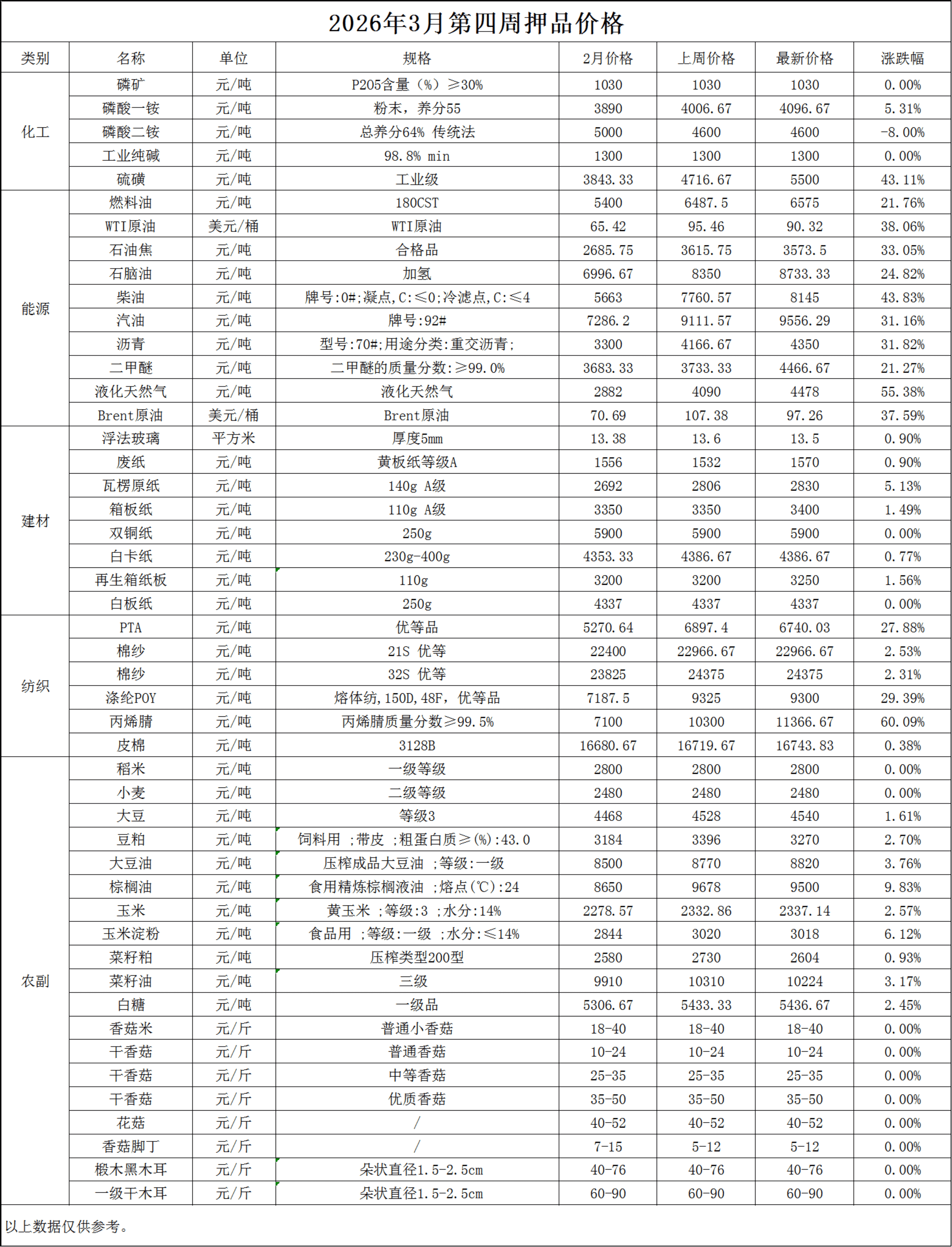 分类: 价格监测2026年3月27日分享此文章文章导航历史的文章历史的文章:2026年4月第一周押品价格监测未来的文章未来的文章:2026年3月第三周押品价格监测近期要闻2026年4月第一周押品价格监测2026年4月3日2026年3月第三周押品价格监测2026年3月20日2026年3月第二周押品价格监测2026年3月16日2025年12月第二周押品价格监测2025年12月12日2025年12月第一周押品价格监测2025年12月12日2025年11月第四周押品价格监测2025年12月12日
