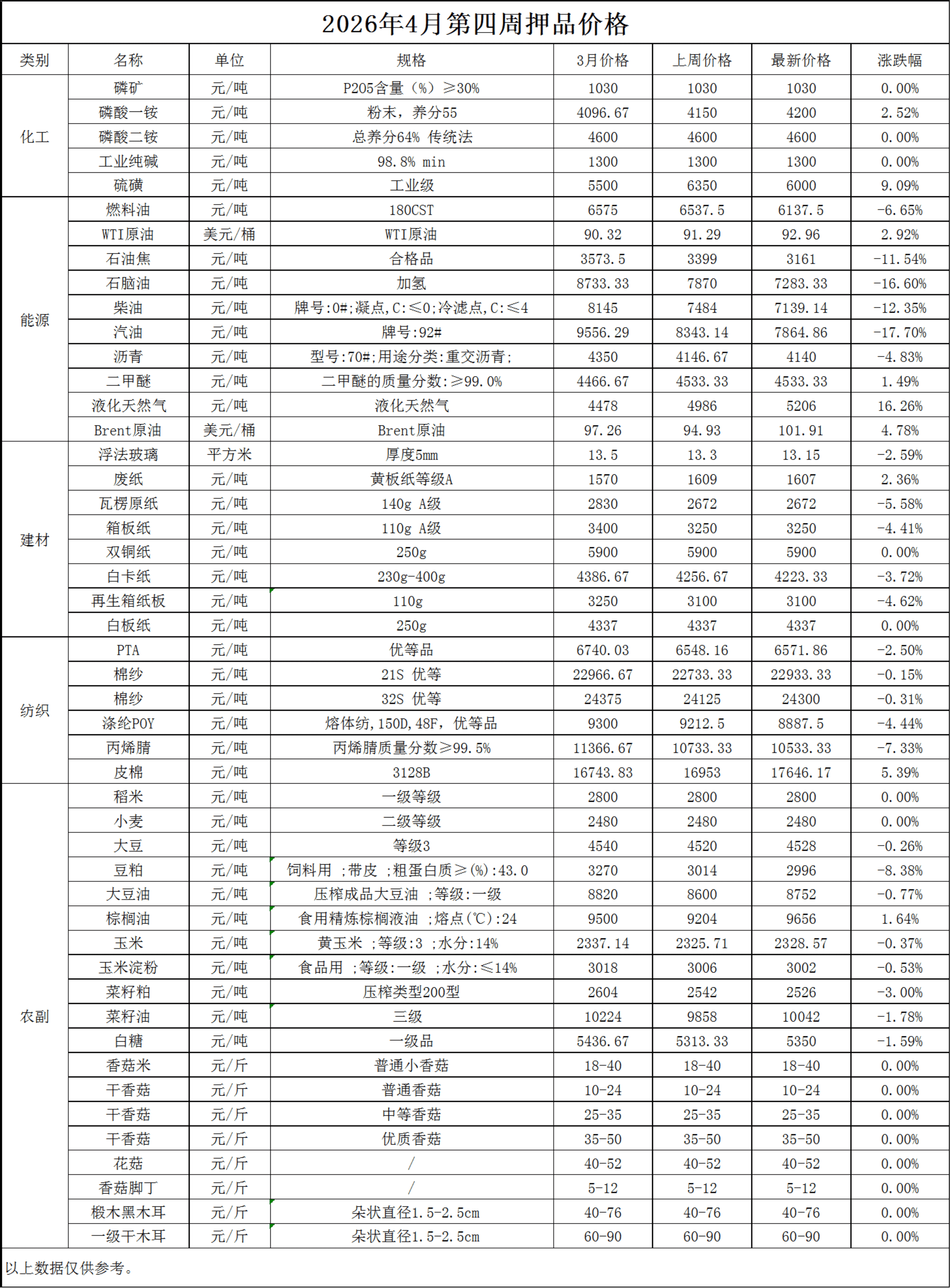 分类: 价格监测2026年4月24日分享此文章文章导航未来的文章未来的文章:2026年4月第三周押品价格监测近期要闻2026年4月第三周押品价格监测2026年4月17日2026年4月第一周押品价格监测2026年4月3日2026年3月第四周押品价格监测2026年3月27日2026年3月第三周押品价格监测2026年3月20日2026年3月第二周押品价格监测2026年3月16日2025年12月第二周押品价格监测2025年12月12日